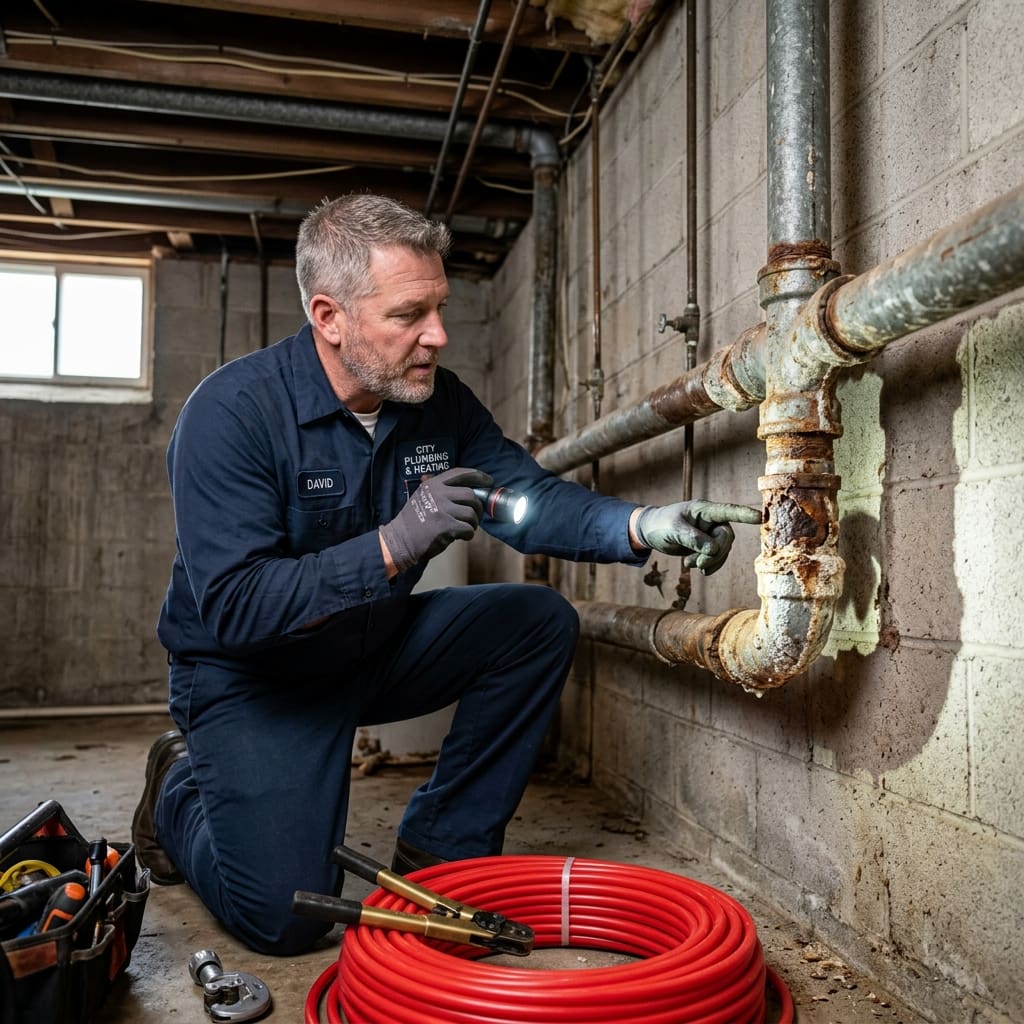 Check under sinks, in basements, and in crawl spaces. Signs like rust, flaking, white buildup, or green discoloration can indicate that your plumbing system is deteriorating. Consider scheduling a whole-home plumbing inspection to assess the full picture.