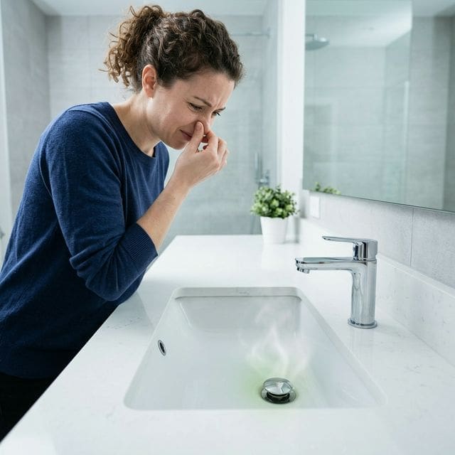 If the smell persists after running water in all drains, if multiple fixtures smell simultaneously, if you hear gurgling from drains, if there’s sewage backup or standing water, if the toilet rocks or has water at its base, or if you can’t identify the source.